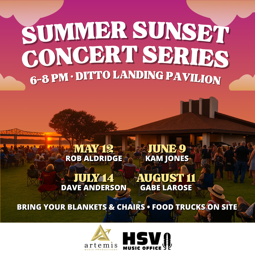 Ditto Landing, the Huntsville Music Office and Artemis Music Productions are excited to announce the Summer Sunset Concert Series every second Tuesday May through August 6-8PM. Come join us at the Ditto Landing Pavilion and enjoy local music along the Tennessee River. It’s open to the public with free admission.